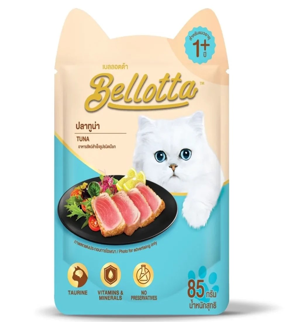 BELLOTTA Premium Pouch with Tuna is the Complete & Balanced Nutrition for Your Cat. As Made in Thailand, Bellotta Maintains Pure Premium Quality Standard. Its Thailand Number # 1 Selling Wet Food Brand. BELLOTTA Contains NO SALT, NO PRESERVATIVES, NO COLOURS & NO SODIUM NITRATES. BELLOTTA Pouch is a Yummy Wetfood that Cats of All Breeds Love to Eat and It’s very Easy to Digest. This Delicious Meal Providing 100% of All Essential Nutrients that Cats Need to Stay Healthy and Strong. Made with Best Quality Ingredients Sourced from Nature. Made of Quality Fish to Provide Amino Acids to Maintain Good Muscle Mass by Giving High Protein. Optimum Fat Ensures High Energy and Essential Fatty Acids Maintain Healthy Skin and Shiny Coat. All Necessary Vitamins for Body Functions and Enhancement of the Immune system are Included. All Necessary Minerals for Body Functions and Strengthen Bones and Teeth are Included. Taurine Plus Ensures Proper Eye & Brain Function.